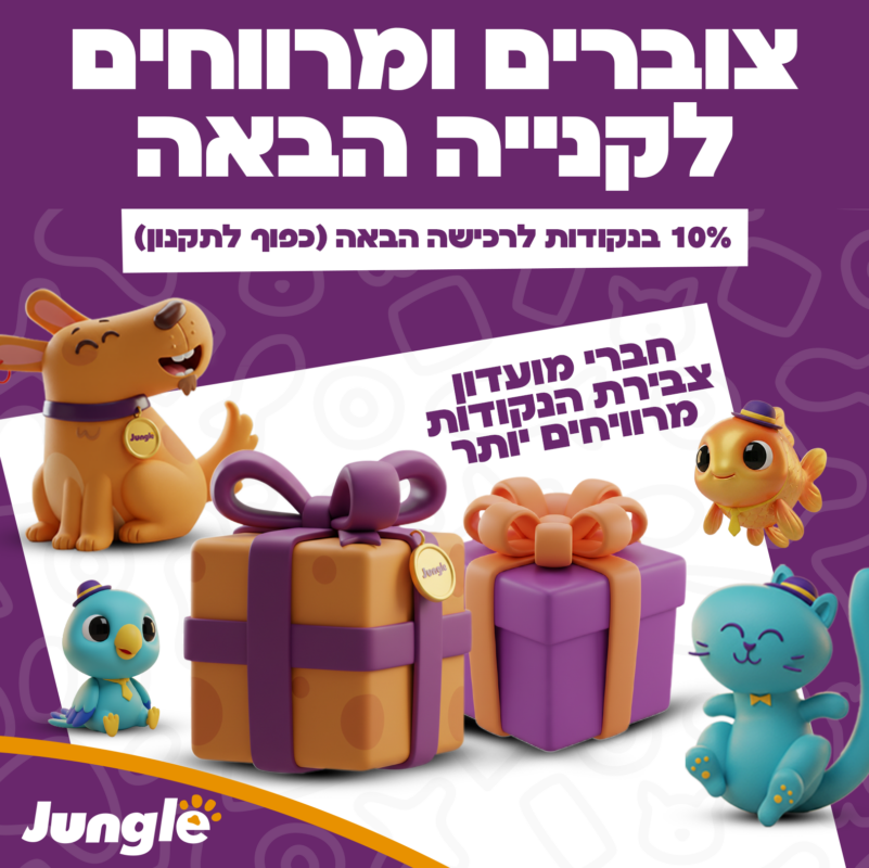 בכל קנייה באתר הג׳ונגל אתם צוברים נקודות שתוכלו לממש כהנחה בקנייה הבאה, באתר ובמעל 15 סניפים ברחבי הארץ. על כל 100 נקודות תקבלו 20 ש”ח הנחה. הצבירה היא 10% מסכום הקנייה.